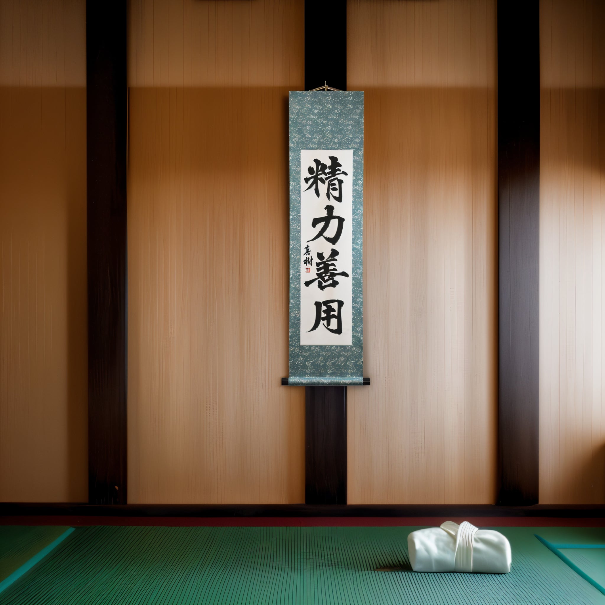 This Japanese calligraphy scroll features the timeless phrase 精力善用 (Seiryoku-Zenyō) — translated as "Maximum Efficient Use of Energy". It is one of the two core principles of Judo, alongside 自他共栄 (Jita-Kyōei, "Mutual Welfare and Benefit"), both established by Judo’s founder, Jigoro Kano (嘉納治五郎).